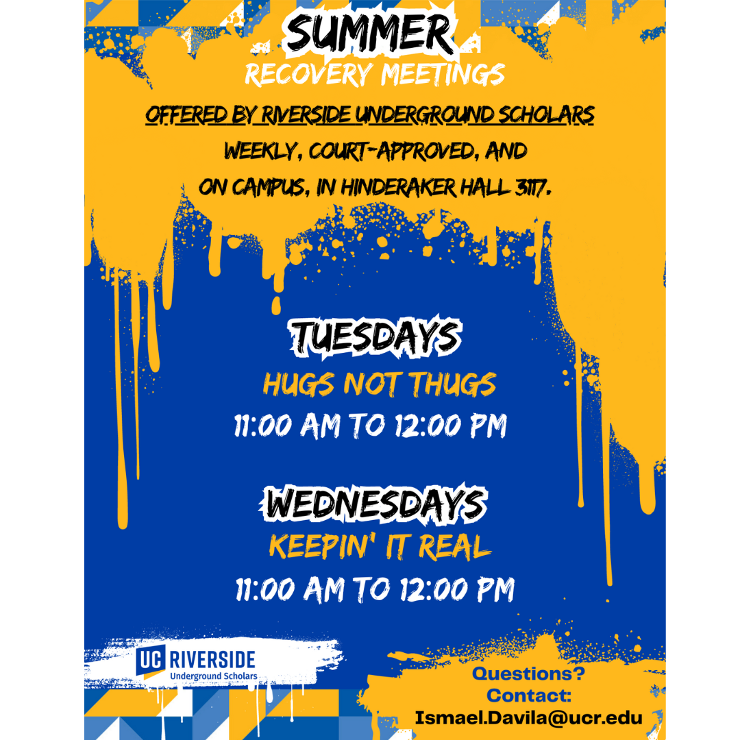 Summer recovery meetings offered by Riverside Underground Scholars, Weekly, Court-approved and on-campus in Hinderaker Hall 3117. Tuesdays and Thursdays 11AM -12PM. For questions contact Ismael.Davila@ucr.edu