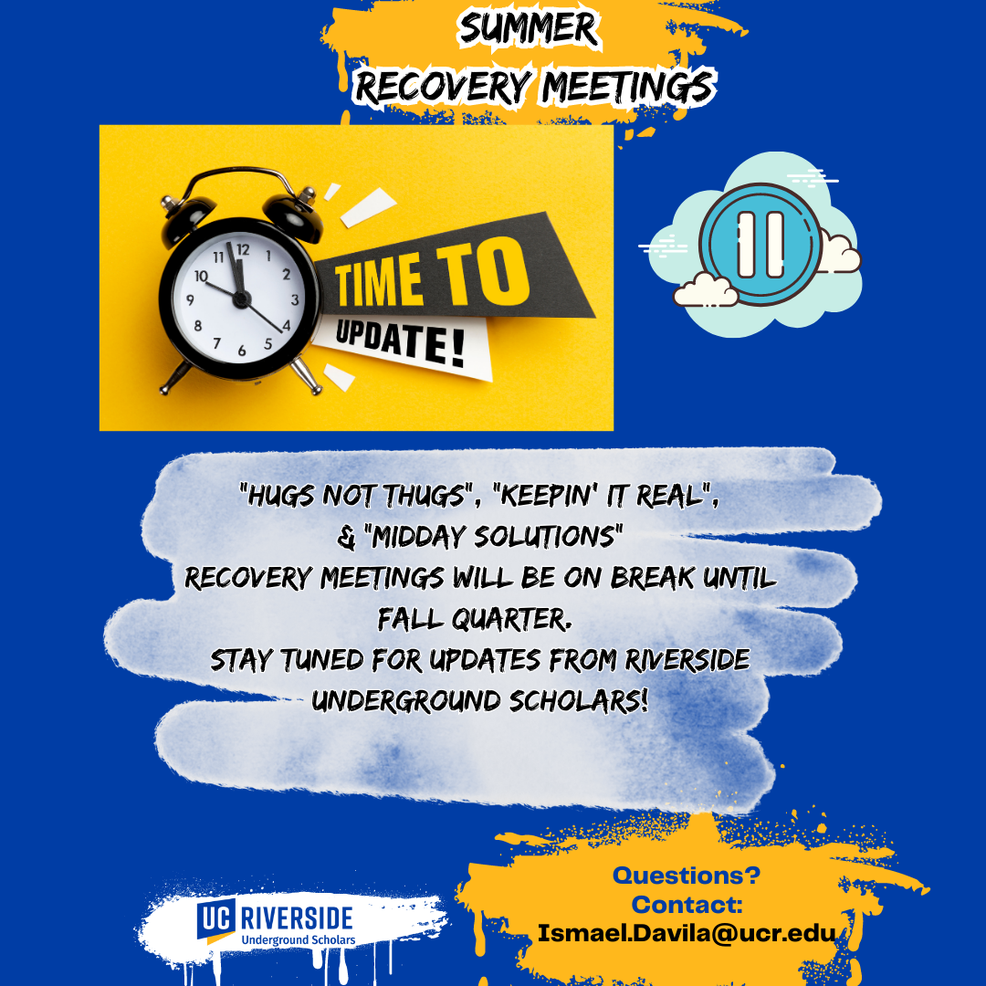 Summer recovery meetings offered by Riverside Underground Scholars will start back in Fall Quarter 2023 or questions contact Ismael.Davila@ucr.edu