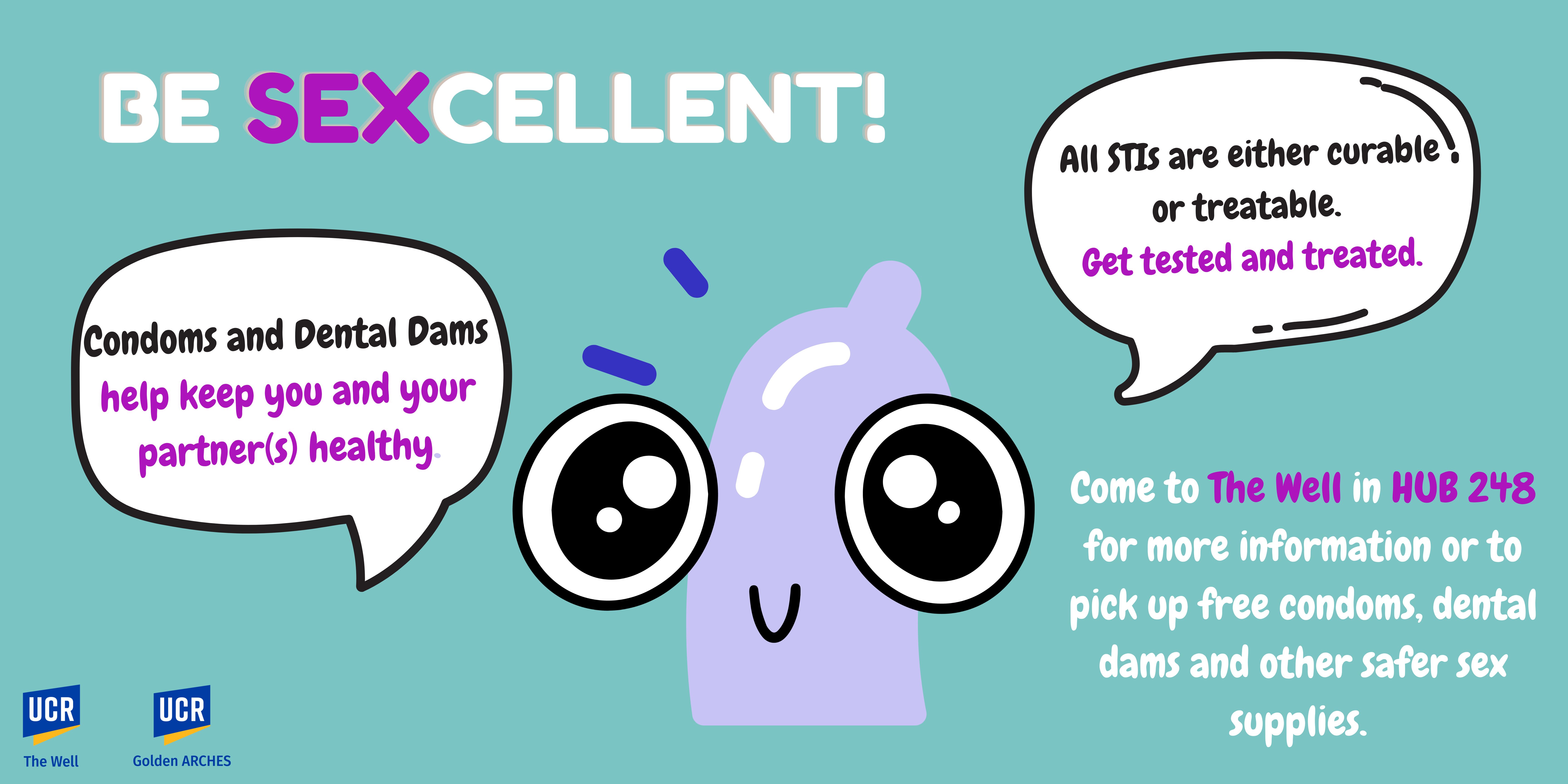 Cameron the condom with big eyes and conversation bubbles. be sexcellent! Condoms and dental dams help keep you and your partner's healthy. All STIs are curable or treatable. Get tested or get treated. Come to The Well in HUB 248 for more information or to pick up free condoms, dental dams and other safer sex supplies.