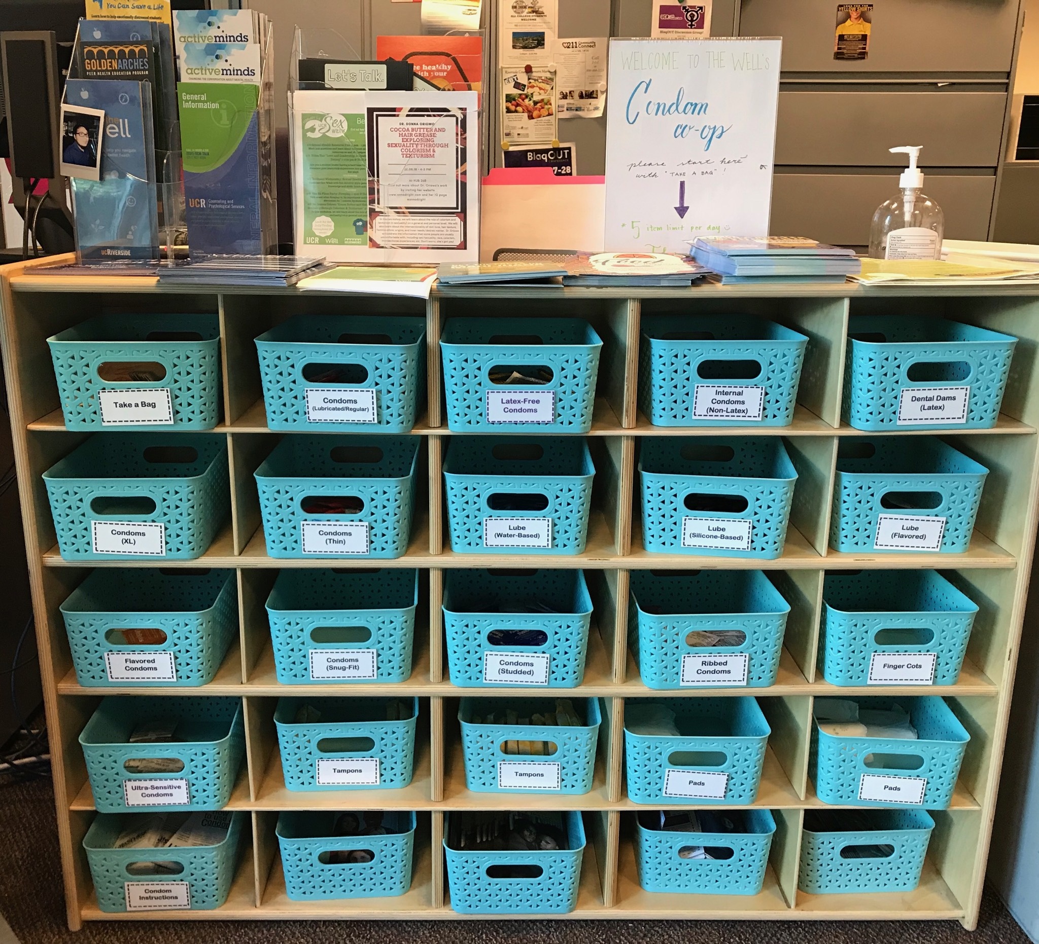 The Well's Condom Co-Op station is a wooden shelf of individually-labelled blue bins stocked with safer sex supplies