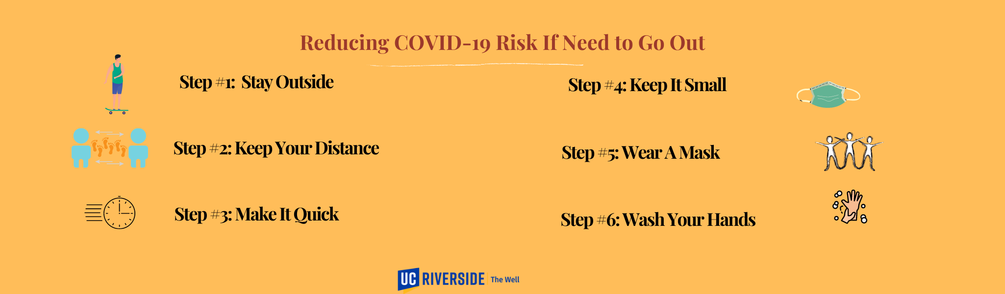 Reducing COVID-19 Risk if Need to Go Out. Stay outside, Keep your distance,  Keep it Quick, Keep it small, wear a mask, wash your hands