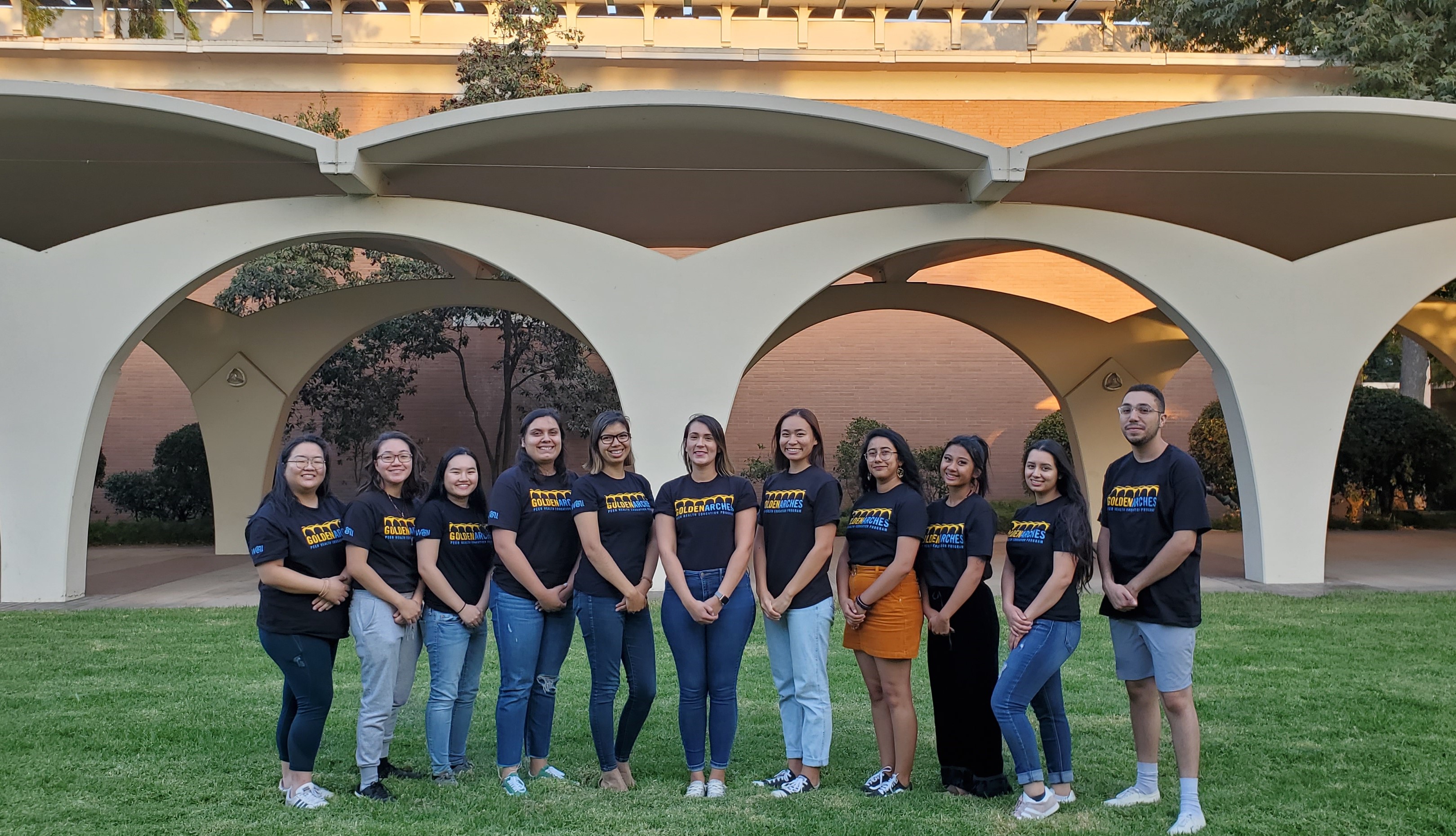 12 people with Golden ARCHES t-shirts standing in front of the Rivera Library arches, smiling and posing in a straight line