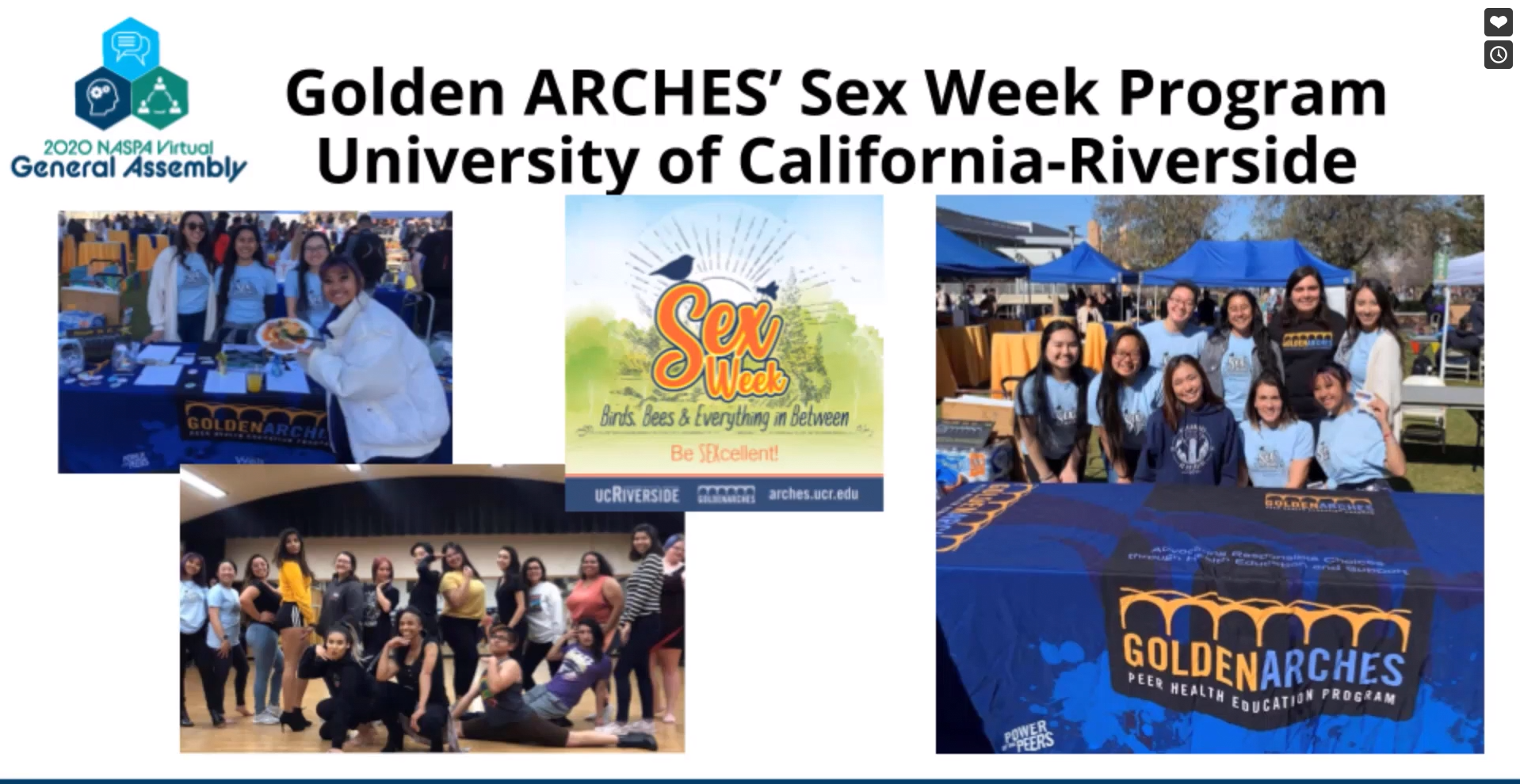 2020 NASPA Virtual General Assembly. Golden ARCHES Sex Week Program University of California Riverside. Sex Week Logo. Several photos of peer educators with Sex Week T- shirts.