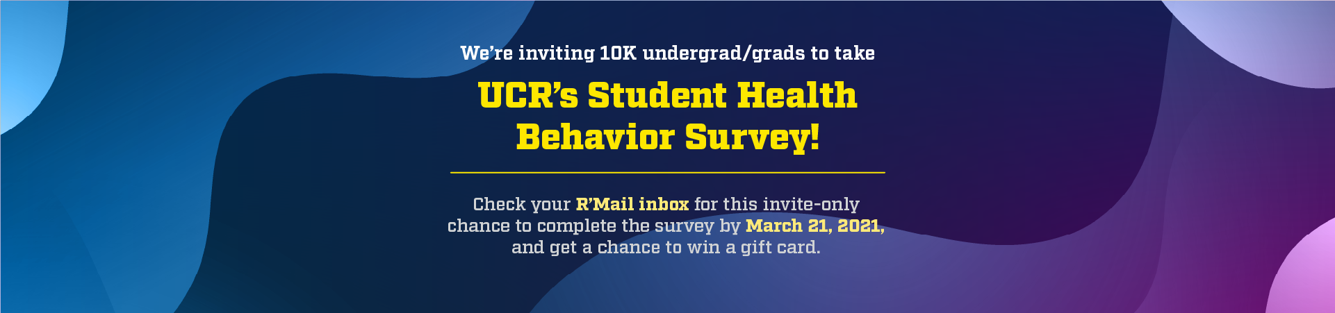 Take UCR’s Student Health Behavior Survey and enter to win one of 50 gift cards! Check your R’Mail inbox for this invite-only survey.