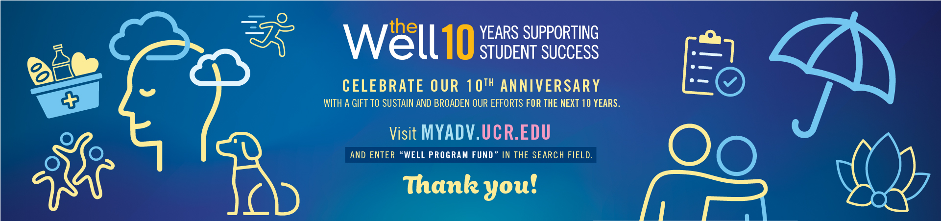 Celebrate the Well's 10th Anniversary. with a gift to sustain and broaden our efforts for the next 10 years. Visit myadv.ucr.edu. and enter “WELL Program Fund” in the search field.